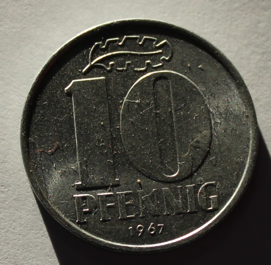 10 пфеннигов 1967г. ГДР. А, алюминий, состояние XF.
