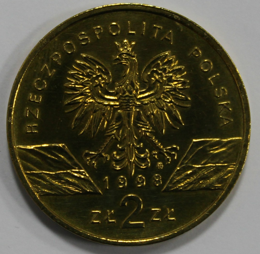 2 злотых 1998г. Животный мир. Жаба камышовая , гурт гладкий, латунь, вес 8,15гр, диаметр 27мм, состояние UNC, тираж 420 тыс.экз.