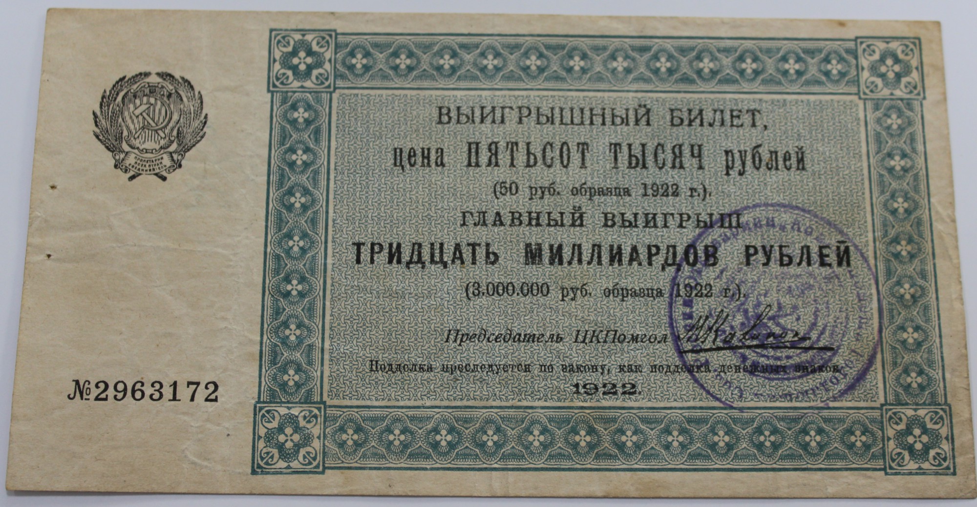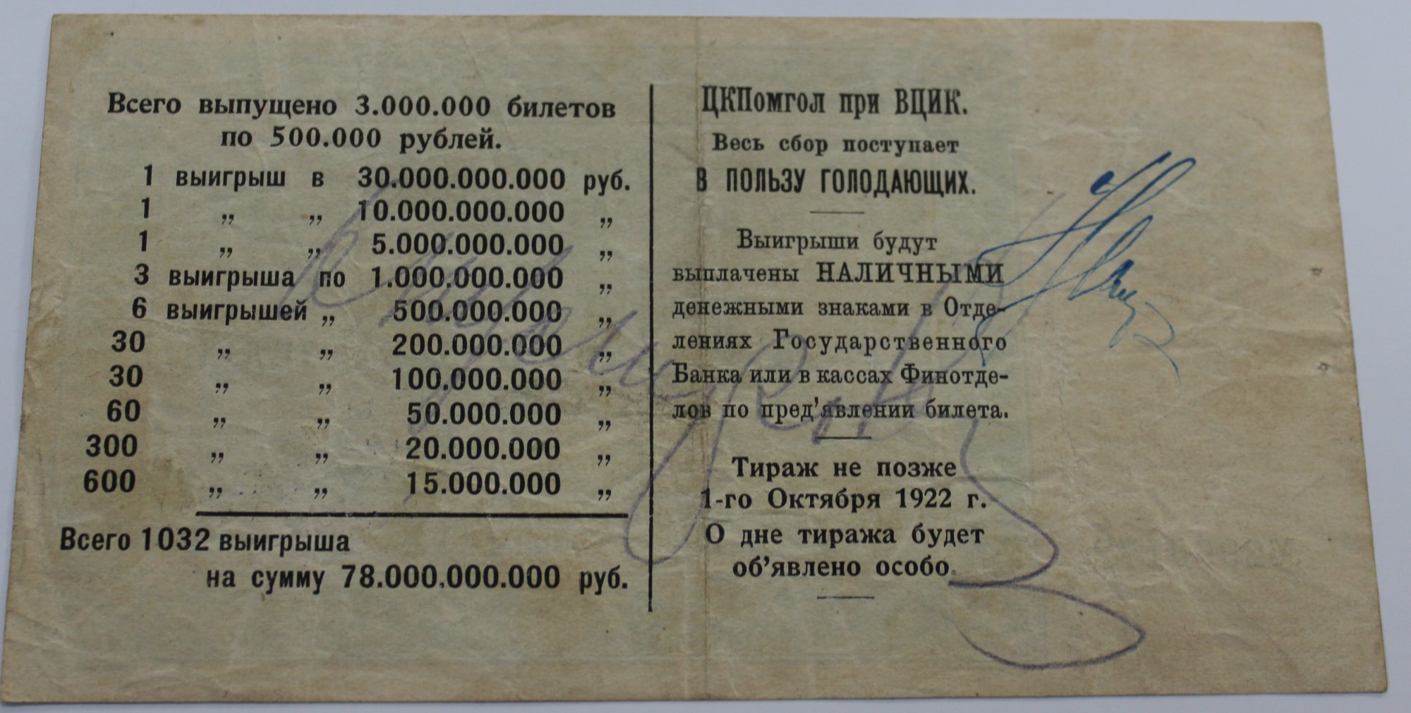 Лотерейный билет ЦК Помощь голодающим при ВЦИК РСФСР 1922г. С подписью М.И.Калинина.