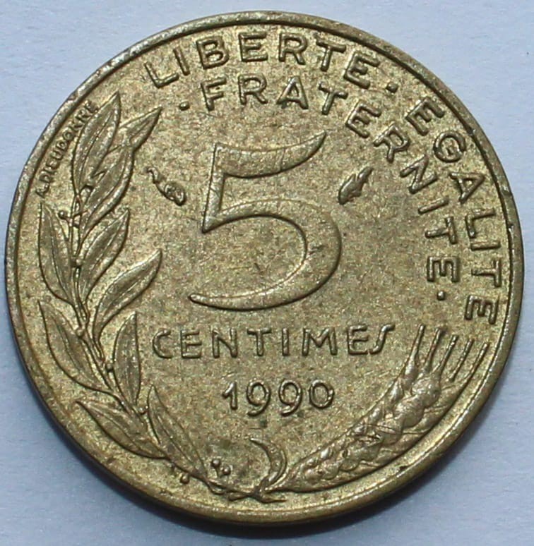 5 сантимов 1990г. Франция,бронза,состояние VF