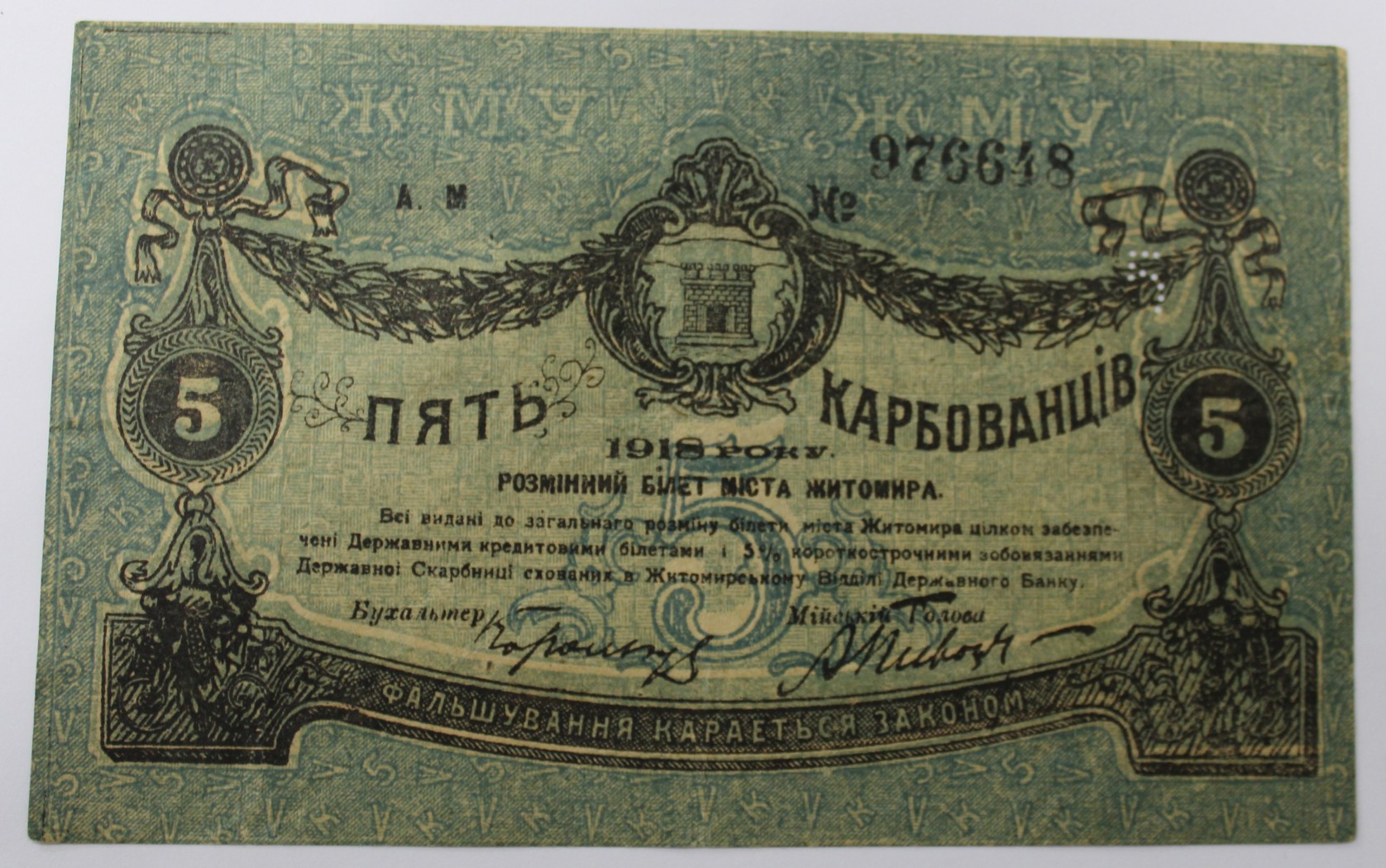 Банкнота 5 рублей 1918г. Разменный билет г. Житомир, состояние XF.