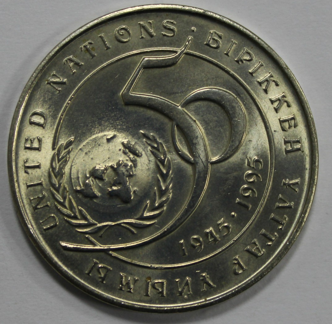20 тенге 1995г. Казахстан. 50 лет ООН, состояние UNC.