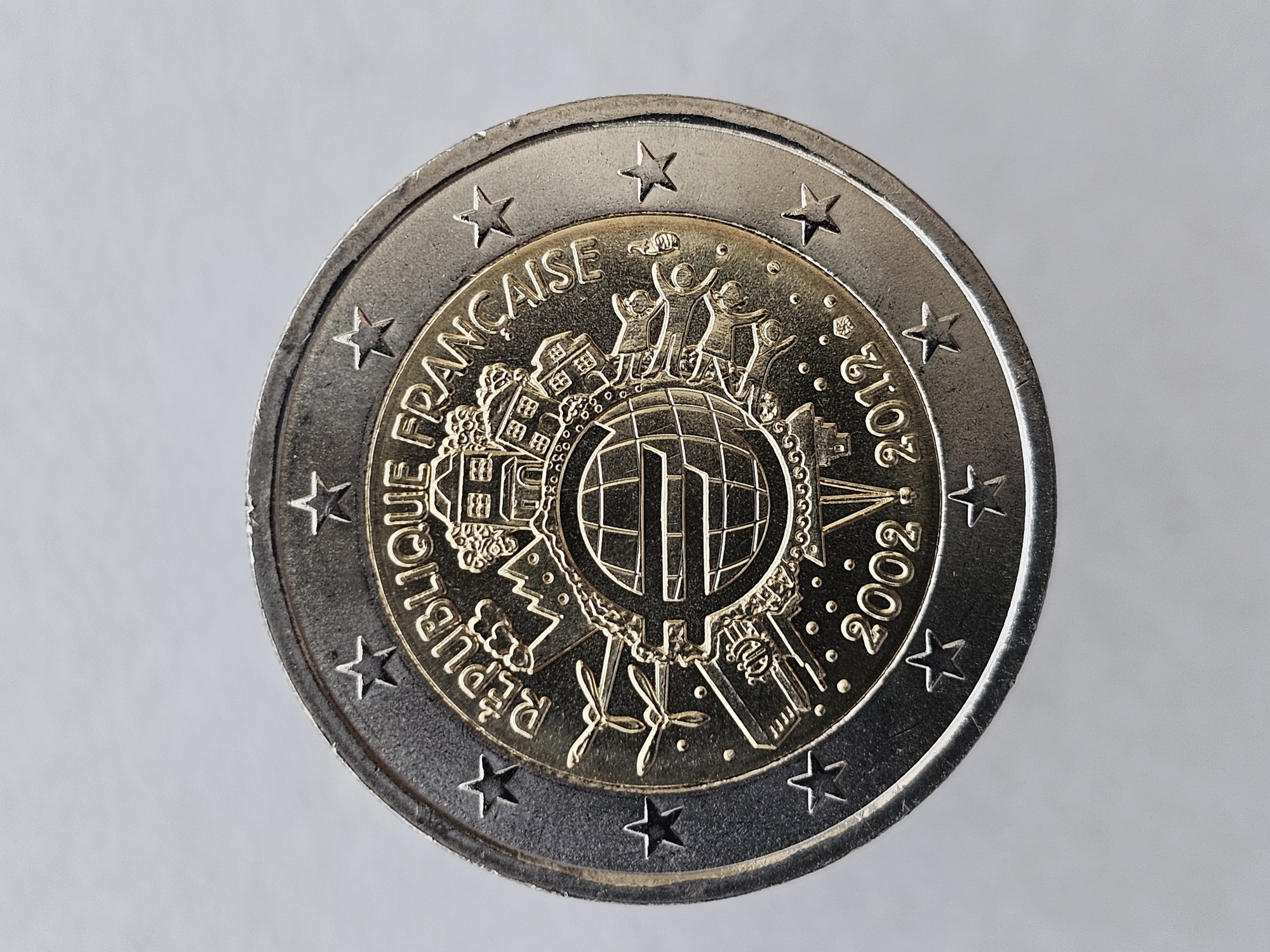 2 евро 2012г. Франция. 10 лет наличному евро, из ролла