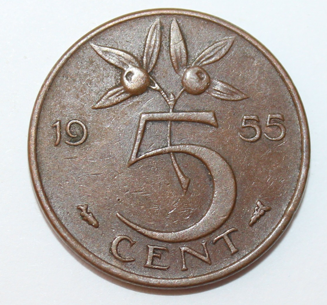 5 центов 1955г. Нидерланды, бронза,состояние ХF, патина.