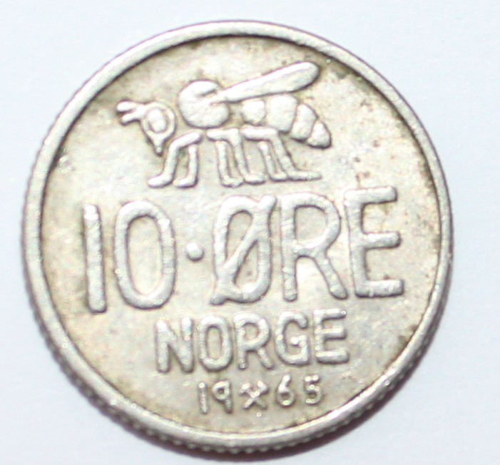 10 эре 1965г. Норвегия, Пчела, никель,состояние ХF