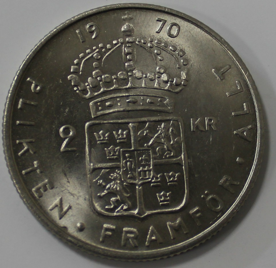 2 кроны 1970г. Швеция, никель. состояние UNC
