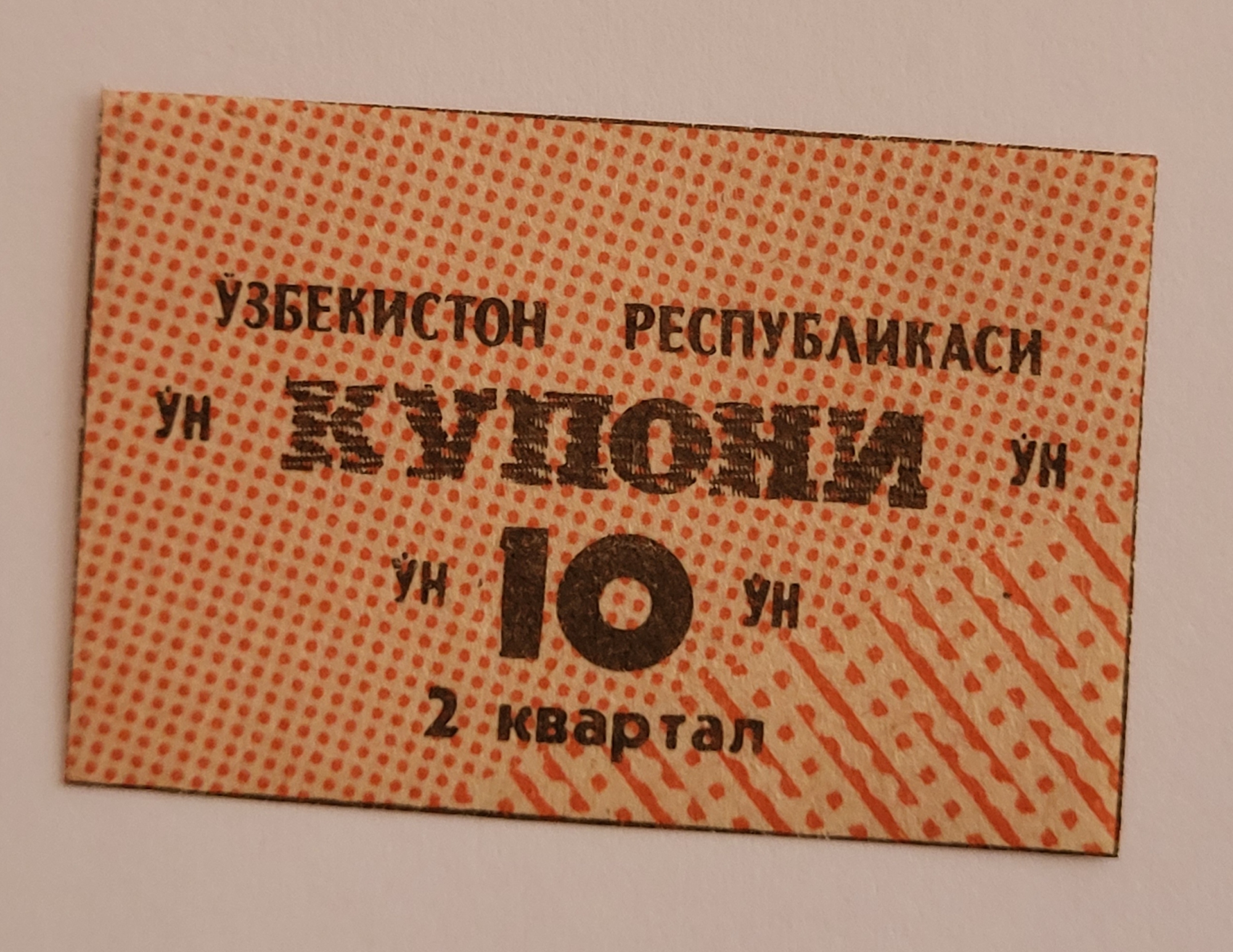 Банкнота 10 купонов 2 квартал 1991г. Узбекистан, состояние UNC